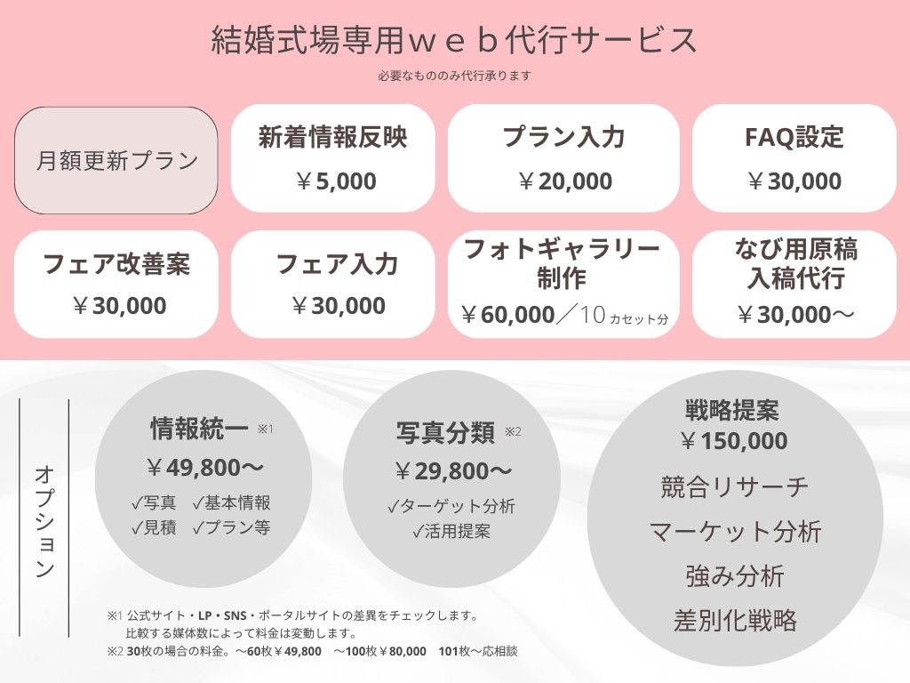 HP・ゼクシィ・Instagramなど、最大3媒体までの情報を棚卸しし、内容や見せ方を整えます。